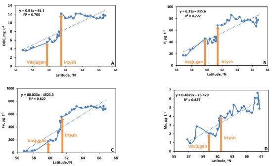 One potentially important tributary of the Ob River is the Vasyugan River. This tributary drains the largest world mire [], and thus, it can substantially modify the Ob River chemical composition via delivering a number of DOM-bound elements. To assess this impact, the degree of element enrichment in the northern part of the Ob River (downstream of the Irtysh) was compared to its intermediate part (between Vasyugan and Irtysh) and the southern part (between Tom and Vasyugan). For this, we calculated the average concentrations of DOC and major and trace elements in these three segments of the main stem (Table 1). It can be seen that the elements mostly enriched (by a factor of 2 to 10) in the northern part of the river were DOC, Cl, P, Mn, Fe, some divalent metals (Mn, Ni and Pb) and insoluble lithogenic elements (Al, Ti, Nb, Y, REE, Ti, Zr, Hf and Th).