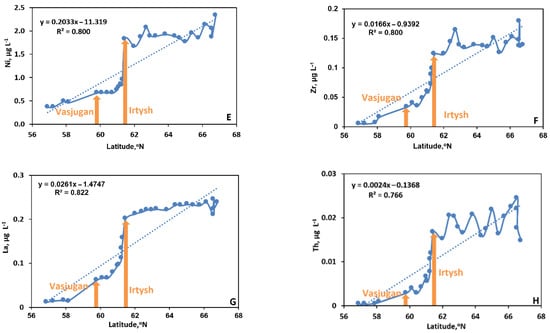The second group of elements included DOC, P, Mn, Al, Fe, Ti, Ni, Cu, Co, Rb, Pb, Y, Zr, Nb, REEs, Hf and Th, which strongly (by a factor of 2 to 10) increased their concentration from the south to the north (Figure 3). An increase in these element concentrations in the main stem of the Ob River occurred after the confluence, first, with Vasjugan and, then, with Irtysh; the impact of the Irtysh was especially seen for major anions (Cl and SO4), alkali (Na and K) and Pb (Figure S1 of the Supplementary Material). Finally, a group of elements did not exhibit any sizable (>1.5 x) change in concentration over the main stem (Si, Li, V and Ba), or the evolution of their concentration did not follow any specific pattern (B, Mg, Cr, Zn, Cd, Ga, Ge, Cs and Tl), as illustrated in Figure S2. Note, some peaks in concentrations were detected for Zn, Cd and Pb, which could be tentatively linked to local pollution sources.