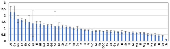 Another landscape parameter is the presence of podzol soils at the watershed. Similar to glacial quaternary deposits, these soils lead to enrichment of the river water with low mobile, lithogenic elements, such as Al, Cr, Ga, REE, Hf and Th (see Table S3). These elements mark the presence of primary silicate minerals, often developed on felsic moraine, as has been shown in European boreal regions (i.e., ref. []).