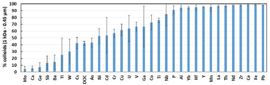 The dialysis procedure allowed a first-order assessment of the colloidal fraction (defined as the % of the element in the 1 kDa—0.45 µm fraction, divided by its total dissolved concentration in the <0.45 µm fraction). The percentage of colloidal fraction ranged from 0–10% (Cl, SO4, DIC, Na, K, Li, B, Si, Mg, Ca and Mo) to 80–90% (trivalent and tetravalent hydrolysates), as listed in Table S4. In the northern part of the basin (downstream of the Irtysh), the distribution of the colloidal forms of elements among the tributaries and the main stem was quite homogeneous. This allowed identification of three main groups of solutes with respect to their colloidal status (Figure 5): (1) alkalis and alkaline-earth metals, major anions and Si and trace oxyanions (Mo, Sb and Ge) presenting between 0 and 20% of colloidal forms; (2) DOC, divalent transition metals (Ni, Cu and Cd), V, Cr, Cs, Tl, W and U, which were sizably impacted by colloids (20–70%) and (3) P, Fe, Mn, Co and all trivalent and tetravalent hydrolysates (Al, Ga, Y, REEs, Ti, Zr, Hf and Th), which were present essentially (>70–80%) in the colloidal form.