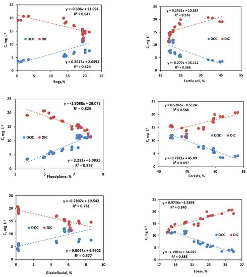 The main stem of the Ob River and its tributaries sampled in this study exhibited strong variability in the main landscape parameters, such as watershed size; mean annual air temperature (MAAT) and permafrost, forest, lake, bog and floodplain coverage, as well as the type of soil and Quaternary deposits. The main environmental parameters of the Ob River basin progressively evolved from the south to the north, which allowed testing of the impact of the climate and landscape on the element concentration in several selected points of the main stem. The latitude of the sampling point; the permafrost coverage and the proportion of bogs, lakes, floodplain, lacustrine and fluvio-glacial Quaternary deposits of the watershed strongly correlated (p < 0.05) with DOC, Fe, P, divalent metals (Mn, Co, Ni, Cu and Pb), Rb and low mobile lithogenic trace elements (Al, Ti, Cr, Y, Zr, Nb, REEs, Hf and Th) concentrations (Table S3A,B, Figure 6 and Figure S5). Note that the impact of permafrost was especially strong in the northern part of the river basin. The pH and concentrations of soluble, highly mobile elements (DIC, SO4, Ca, Sr, Ba, Mo, Sb, W and U) positively correlated with the proportion of forest, loess and fertile soils and eluvial, eolian, and fluvial Quaternary deposits on the Ob River watershed (Figure 6 and Figure S5, where a number of the most important parameters, such as forest coverage (pH, Ca, Mo and U), floodplain area (DOC, P, Fe, Th) and watershed coverage by fluvio-glacial deposits (DOC, Al, Fe and La) are illustrated). Other landscape factors were of secondary importance for element control, yet they exhibited sizable correlations with particular elements. Examples are podzol soil coverage of the watershed that was positively linked to the concentration of Al, Cr, Ga, Th and saline soils that positively impacted the concentration of Cl, SO4, Li, B, Na, K, As and Rb in the river water.