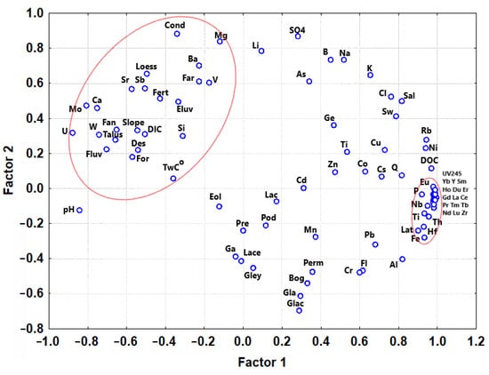 Results of the PCA treatment of all of the dataset (the Ob River main stem and tributaries), including the elementary composition of the river water and landscape parameters of the watersheds. The landscape parameters (% of watershed coverage) are abbreviated as follows: For, Forest; Fl, floodplain; Perm, permafrost; Far, farmland; Pre, pre-Quaternary deposits; Glac, glacial deposits; Slope, slopewash deposits, Des, deserptium (rock stream deposits); Lac, lacustrine and glacio-lacustrine deposits; Fan, fan-alluvial deposits; Gla, glacial deposits; Eol, eolian deposits; Pod, podsols; Sal, saline soils; Fert, fertile soils; TwC°, Water temperature; Cond, Specific Conductivity.