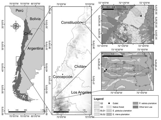 The study area comprised four coastal catchments in south-central Chile: Quivolgo 2 (Q2), Quivolgo 3 (Q3), Bajo las Quemas 1 (BLQ1) and Bajo las Quemas 2 (BLQ2). The Quivolgo catchments are located near the city of Constitución (35.20° S), while those of Bajo las Quemas are located near the town of Curanilahue (37.28° S) (Figure 1).