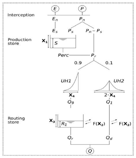 The GR4J model employs four parameters—X1: maximum storage capacity (mm); X2: groundwater exchange coefficient (mm); X3: maximum channel transit capacity (mm); and X4: base time of unit hydrograph (days) [] (Figure 3).