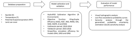 The GR6J model considers an additional parameter that gives a more detailed analysis in the model structure, resulting in a higher quality simulation of low discharge. Thus, the X6 parameter corresponds to the exponential storage vacuum coefficient and can only take values greater than or equal to 0 [,]. A better understanding of the methodological steps followed for this research work is shown in Figure 4.