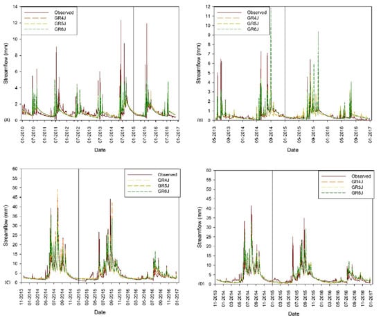 Simulated and observed discharge for (A) Q1, (B) Q2, (C) BLQ 1 and (D) BLQ2 using the GR4J, GR5J and GR6J models for the calibration and validation period. Vertical line represents the end of calibration period and start of the validation period (1 January 2015).