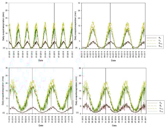 Daily potential/actual evapotranspiration for: Q2 (A), Q3 (B), BLQ1 (C) and BLQ2 (D) using Oudin model (EO), Hargreaves–Samani (EH) model, potential Priestley–Taylor (ETPp) model and actual Priestley–Taylor (ETPa) model, in the calibration and validation period. Vertical lines represent the end of calibration period (right) and beginning of validation period (left).