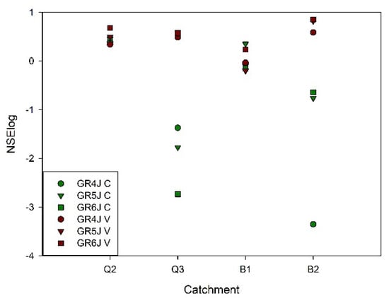 Dry season discharge simulation, or summer flow, was not satisfactory in all catchments for all three hydrologic models in the calibration period. NSElog showed low values (<0.5) for all catchments and all models (Figure 7). IOA, MAE, MAPE, SI and BIAS were not used because NSElog estimates better low flows as it decreases the influence of maximum flow rates []. However, it was observed that models had low capacity to simulate low flows in detail, but they followed the temporal dynamics of summer flows. The GR6J model had the best performance to simulate low flows; in the same way, all the catchments reached peak values in the validation period rather than in the calibration period.
