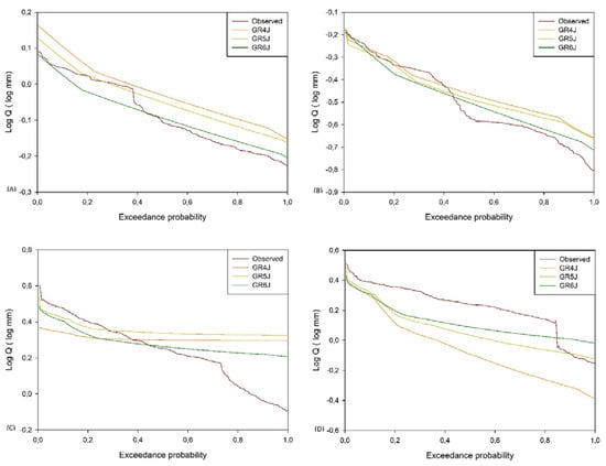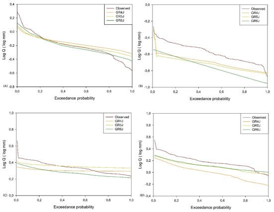 Additionally, during calibration, the exceedance probability curves showed that GR6J underestimated low flows in Q2, while GR4J and GR5J overestimated low flows lower than 0.8 mm; in Q3 and BLQ2, the three models underestimated low flows; and finally, in BLQ1, GR6J underestimated low flows, while GR4J and GR5J underestimated low flows higher than 2.51 mm and 1.99 mm, respectively. In the validation period, the GR4J and GR5J models overestimated low flows in Q2, while the GR6J model overestimated low flows lower than 0.79 mm; in Q3, the GR4J, GR5J and GR6J models overestimated low flows lower than 0.39 mm, 0.35 mm and 0.34 mm; and in BLQ1, the three models underestimated low flows higher than 1.99 mm for GR4J, 2.2 mm for GR5J and 1.90 mm for GR6J. Finally, GR4J underestimated low flows in BLQ2, while GR5J and GR6J underestimated low flows higher than 0.7 mm and 1.2 mm, respectively (Figure 8 and Figure 9).