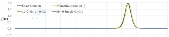 in which is the value of at the j-th node and the superscript indicates the “exact solution”. After all the runs are performed, a function is obtained by the multiple value regression. In this study, the third degree polynomial is chosen as the regressive function. In all the further example cases, the value of is determined by this regressive function. Figure 1 shows the results of and . The root mean square errors are 0.0155 m and 0.0345 m, respectively. The exact solution and the numerical result of [3] are also plotted for comparison. The comparison shown in Figure 1 indicates that accuracy is improved using smaller nodal resolution and time increment. The solitary wave in the numerical model of [3] seems propagating faster slightly. As we look at the position of the wave crest, the result of the present model is closer to the exact solution.