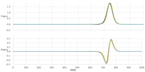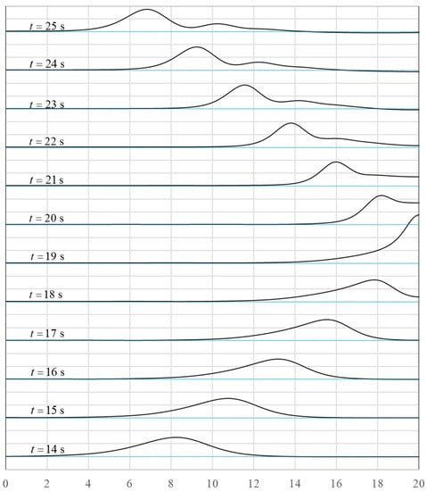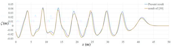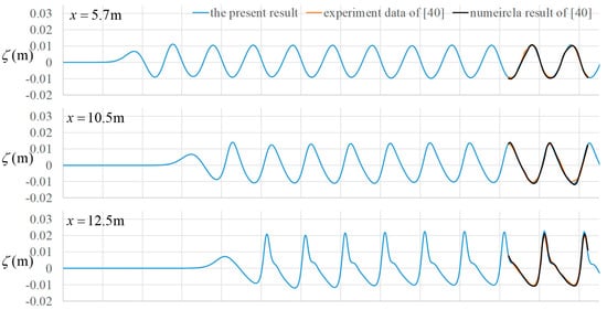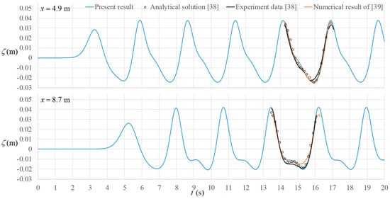 The unit of is m/s. The domain of computation is 50 m in length. Simulation of is performed. Numerical results are compared with the observed time series of the free surface elevation at and , as well as with the analytic solution [38] and other numerical data [39]. Figure 5 shows the comparisons. In [38,39], only the peak-to-peak data within one wave period were shown. We match our results with the experiment data at the peaks and check the phase difference between the two wave gauges. At , the comparison starts at . According to the dispersive relation, the wavelength of the prime constituent is 5.13 m. The distance between the two wave gauges is 3.8 m. Therefore, the shift of the peaks between the two wave gauges is 0.74 s. This is validated in Figure 5. The comparison shows that the numerical result is quite close to the experiment data and the analytical result [38]. Figure 6 shows the comparison of the free surface profile at with the result of [39]. Good agreement between the two numerical results through the entire domain is found.