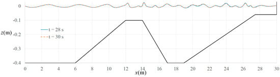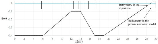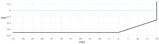 Several non-breaking wave tests in a physical water flume were carried out by [40] to study the modulation of the monochromatic waves traveling over a submerged structure and were used to verify their numerical boundary element method (BEM) model. The layout of the experiment is depicted in Figure 7. The toe of the submerged dike is at . The water depth is 0.4 m in front of the obstacle and 0.1 m above the dike. The slopes of the front part and the rear part of the dike are 1:20 and 1:10, respectively. The width of the top is 2 m. In the experiment, a 1:25 slope starting at was placed in the rear part of the flume to dissipate the wave energy from reflection by wave breaking. We use a shallow water region with a very rough bottom as a replacement for wave energy dissipater. The length and the depth of this shallow water region are 2.5 m and 0.06 m, respectively. The bottom of the channel is frictionless in the range of and very rough in the range of . The Manning’s coefficient in the rough bottom region is 0.02.