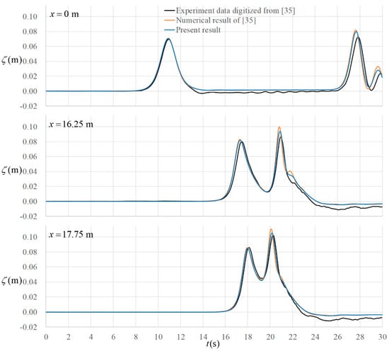 Numerical results are compared with the observed time series of the free surface elevation at , , and , respectively, shown in Figure 4. The numerical results of [35] are also potted in this figure for comparison. On each panel the first peak corresponds to the incident wave while the second and subsequent peaks are referred to the reflected waves. The comparison shows that the prediction of the present model is quite close to the numerical result of [35] which was computed with a finite element model.