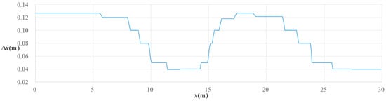 Nodes in the computational domain are irregularly distributed, with various nodal spacing in accordance with the water depth. Totally, there are 430 nodes. The nodal spacing is controlled by the condition that is greater than 1.5. The range of nodal spacing is 0.04–0.125 m, as shown in Figure 8.