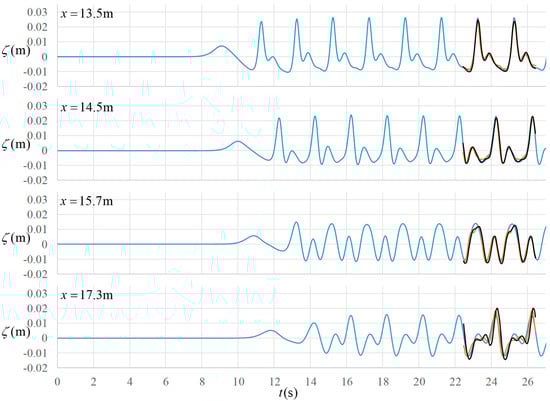Time series of the free surface elevation observed at 7 wave gauges are used for comparison. The positions of these wave gauges are , , , , , , and , respectively. The case of incident wave height 0.02 m and the wave period 2 s is chosen for verification. According to the wave maker theory [37], the stroke of the wave paddle in the wave maker is 2.953 cm. Therefore, the boundary flow velocity given at is