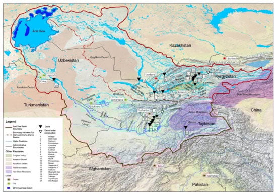 - Anarbekov, O.; Giska, S.; Dörre, A.; Cassara, M.; Beekma, J.; de Strasser, L.; Murzaeva, M. The Aral Sea Basin: Local and National Institutions and Policies Governing Water Resources Management; Routledge: Oxfordshire, UK, 2019; pp. 136–154. [Google Scholar] [CrossRef]