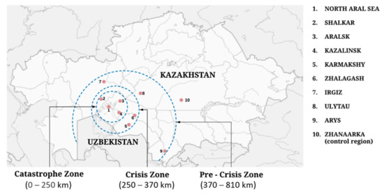 The law in Kazakhstan “On the social protection of citizens affected by the environmental disaster in the Aral Sea region” [23] divided the study area into three zones by administrative division: catastrophe, crisis, and pre-Crisis. The criteria for determining the boundaries were (1) for the catastrophe zone: steady growth of mortality rate, forced migration for environmental reasons, enormously exceeded concentrations of the pollutants in the environment, destruction of ecosystems, and their loss of the ability to self-recovery, catastrophic shallowing of the water bodies; (2) for the crisis zone: steady growth in the specific morbidity of the population, significantly exceeding the standards of maximum permissible discharge of the pollutants in the environment, a reduction in the species composition and a decrease in the biological productivity of ecosystems by 75 percent, desiccation of water bodies; and (3) for the pre-crisis zone: a steady increase in the ecology-linked diseases, stable exceeding of the concentrations of the pollutants in the environment, reduction in the species composition and a decrease in the biological productivity of ecosystems by 50 percent, desiccation of water bodies. Authors recognized that the scientists have mainly studied the following localities: in the catastrophe zone—Aralsk, Kazalinsk, Shalkar, which is within 0–250 km; in the crisis zone—Karmakshy, Zhalagash, which is within 250–370 km; and in the pre-crisis zone—Arys, Irgiz, and Ulytau, which is 370–810 km from the Aral Sea. The study named “Integrated approaches in managing the health of the Area population” was carried out by the ministry of health and social development of Kazakhstan to investigate people’s health in all the zones mentioned above and compare it to a control zone. These zones were compared to a control region (Zhanaarka), which was beyond 811 km from the Aral Sea (Figure 3).