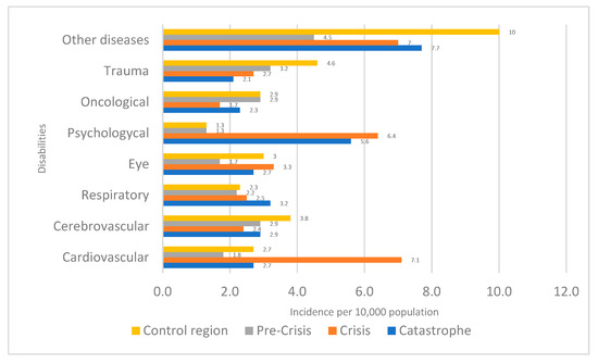 The analysis of the results [64] for the study period 2004–2013 revealed the prevalence of 6 classes of pathology: cardiovascular diseases were perhaps highest, respiratory diseases on the second highest, vision pathologies on the third, and mental disorders were in the fourth most prevalent. The malignant neoplasms followed the rank, with injuries being the last. The disability rate in three zones as compared to the control region is shown in Figure 4 [65]. It can be seen that the incidence rates of respiratory disabilities were highest in the catastrophe zone; cardiovascular and psychological disabilities were peaking in the crisis zone.