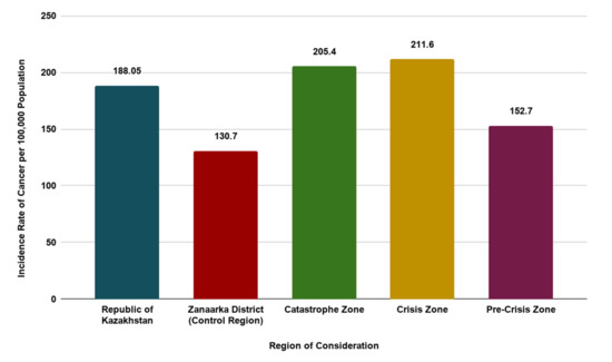 Malignant neoplasm (cancerous tumor) [66] is another health disaster to be considered while analyzing the health effects in the Aral Sea region. To analyze malignant neoplasm incidence, the data of a 10-year (2004–2013) timeframe were considered. The data were reported to be taken from local oncology dispensaries. Figure 5 shows the ten-year average malignant neoplasm incidence in the three disaster zones (catastrophe, crisis and pre-crisis as described in Figure 3), Zhanaarka district, and the whole of the Republic of Kazakhstan for comparison purposes. The incidence rates are calculated for 100,000 populations residing in the regions mentioned above.