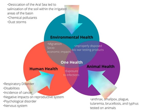 The instance of Aral perfectly fits and establishes conditions for adopting the One Health approach which may arise from a systemic view ranging across scales from molecules to the ecological and socio-cultural context, as well as from the comparison with different disease endemicities and health systems structures. Therefore, in this article, the authors reviewed each factor separately and tried to show their interdependence which is the primary tool of the One Health approach and allows for interdisciplinary research of Aral Sea case.