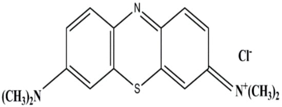 Human’s fascination with “color” has brought a huge revolution to the industrial sector. The textile industry majorly contributes to water pollution by releasing a huge amount of dyestuff as effluent. This untreated or partially treated industrial effluent containing synthetic dye compounds is eventually discharged into water systems, where it causes damage to the aquatic ecosystem [1,2]. Some metal complex-based synthetic dyes are causing severe mutagenic and other health issues even at ppm concentrations [3]. Methylene blue (MB) is one of the most widely used cationic dyes in biological staining and in textile industries because of its faster adsorption on cotton fabric, water solubility and economic benefits. However, MB has been reported to cause diarrhea, eye irritation, vomiting, breathing difficulty, nausea and chronic toxicity in humans, mainly in relation to the central nervous system [4,5]. Therefore, the removal of MB dye molecules from aqueous systems has become a crucial requirement. MB (C16H18 N3SCl) is a heterocyclic aromatic compound with 319.85 g/mol of molecular weight. MB is a cationic dye molecule that has a positive charge and its chemical structure is shown in Figure 1.