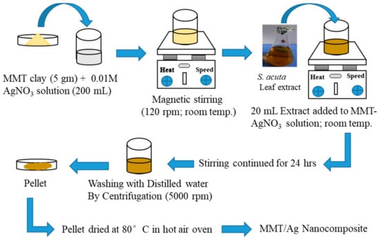 The leaf extract was allowed to cool to room temperature and then filtered to remove pigments and other insoluble fractions. This fresh extract was used for nanocomposite synthesis. For nanocomposite preparation, 10 gm of MMT clay was dried in a hot air oven at 50 °C for 30 min. Figure 3 presents the synthesis procedure for the development of MMT/Ag nanocomposite.