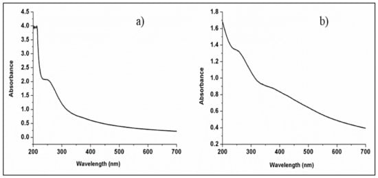 UV-Vis spectra: (a) MMT clay and (b) MMT/Ag nanocomposite.