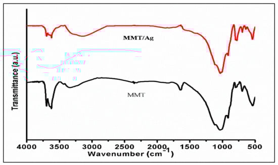 The FT-IR analysis showed that spectra (Figure 6) for MMT and MMT/Ag nanocomposite were quite similar with a slight shift in the band’s position and intensity. In both samples, Si-O and Al-OH were the main functional groups detected in the range of 1000 cm−1 and 500 cm−1.