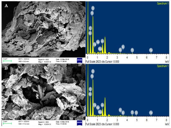 FESEM images and EDX spectrum of (A) MMT clay and (B) MMT/Ag nanocomposite.