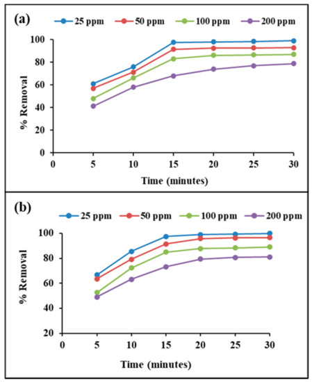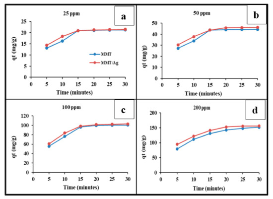 The variations detected in MB adsorption on MMT clay (raw) and MMT/Ag nanocomposite as a function of contact time are shown in Figure 11a–d. The figure shows that the maximum MB adsorption occurred during the initial 15 min. Afterwards, it increased gradually and almost reached equilibrium within 30 min of the initial contact. The faster adsorption rate in the initial time period is because vacant and available sites on the negatively-charged adsorbent surface result in faster adsorption of negative charge-carrying MB dye from the aqueous solution at neutral pH [46,47]. Further, the decreased adsorption rate is due to a lack of available active sites resulting from MB monolayer formation on the adsorbent surface. Similar results were also reported by Vutskits et al. [5] for MB adsorption by activated carbon. The adsorption capacity of raw MMT clay ranged from 13 mg/g to 151.68 mg/g and MMT/Ag nanocomposite ranged from 14.32 to 156.22 mg/g against adsorption of MB dye [48].