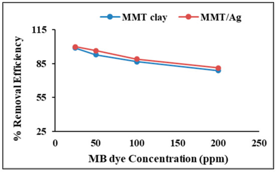 Removal percentage of MB using (a) MMT clay and (b) MMT/Ag nanocomposite.