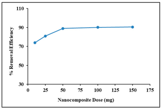 To identify the optimum adsorbent dose, the effects of adsorbent dosage was studied with regard to the amount of MB concentration. In general, increasing the adsorbent dose increases the removal efficiency. Figure 10 shows an increase in the removal efficiency of adsorbents, which is due to the easy and excessive availability of adsorption sites at the nanocomposite surfaces. Increases in the removal efficiency slowed down after 50 mg, which suggested that 50 mg is the optimum nanocomposite dose for adsorption of 100 ppm MB dye from an aqueous solution. The obtained outcome is in good agreement with the results reported by [45].