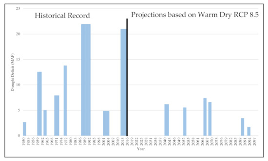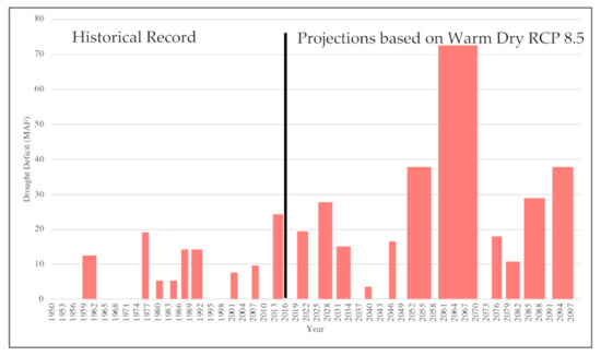 Figure 2 depicts yearly streamflow deficit for the historical period (1950–2015) and under the Warm Dry RCP 8.5 projection model (2020–2099) at one station, Yuba River. The height of the bar represents the drought deficit in MAF. The width of the bars represents the length of the drought period. Streamflow deficits are highlighted as becoming more frequent in the projected time period 2020–2099. For instance, the projected drought from 2060–2070 has a particularly large deficit and is 3–4 times larger in comparison with the historical record. The longest historical (from 1950–2015) drought was four years, while the largest future drought (2060–2070) is 11 years. The largest deficit historically was 24 MAF (29,592 MCM), while the projection is 73 MAF (90,009 MCM) for the 2060–2070 drought.