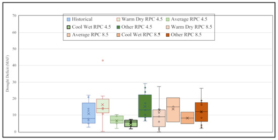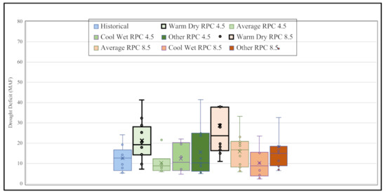 Box plot of Yuba River’s drought deficit quantities historical (1950–2015) under all projected models (2020–2099). Bottom bar and top bars extended from the box represent the lowest and highest usable values. The line in the middle represents the median value in the data. Bottom half of the box represents the lower quartile, and the top half represents the upper quartile. The highlighted boxes are significant (p = 0.05) in terms of different from the historical distribution based on the t-test. (Note: 1 MAF = 1233 million cubic meters).