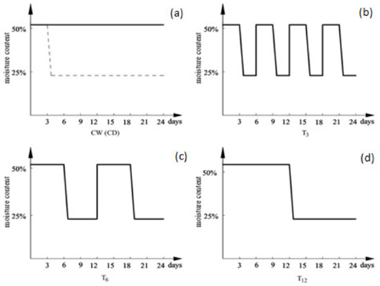 Moisture content design of different drying-rewetting treatments: (a) Continuously wet (solid line), continuously dry (dotted line); (b) Drying-rewetting alternation at an interval of 3 days; (c) 6 days and (d) 12 days.