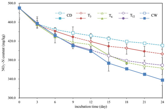 The temporal variations of soil nitrate nitrogen (NO3−-N) content under different treatments are shown in Figure 2. The nitrate contents were reduced continuously for all the treatments. A minimum reduction was observed in the continuously dry (CD) treatment, as the nitrate content dropped from 490 mg/kg to 411 mg/kg at the end of the experiment. The amount of the nitrate reduction in the continuously wet treatment was about 73 mg/kg, which was the maximum reduction in the five treatments. The final NO3−-N content from treatment T3 was lower than that from the CD treatment while higher than that from all other treatments (393 mg/kg and 411 mg/kg in treatment T3 and CD, respectively). Treatment T6 and T12 had similar NO3−-N loss in terms of the final NO3−-N content (369 mg/kg and 363 mg/kg in treatment T6 and T12, respectively). Comparing the dynamics of the nitrate in the different treatments, it is seen that more frequent drying and rewetting cycles lead to less of a drop in NO3−-N content.