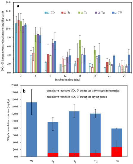 The cumulative NO3−-N reduction under different treatments in the dry and wet period, as well as the overall NO3−-N reduction, are shown in Figure 3b. The soils subject to drying-rewetting alternation generated similar cumulative NO3−-N reduction in the 12 drying days regardless of the treatments. However, it is seen that cumulative NO3−-N reduction in treatment T6 during 12 wetting days contributed most to the overall reduction. Although treatments of T3, T6 and T12 had the same number of drying and wetting days, the cumulative reduction of NO3−-N within the wetting period, as well as the contribution to the overall reduction, was different for each treatment.