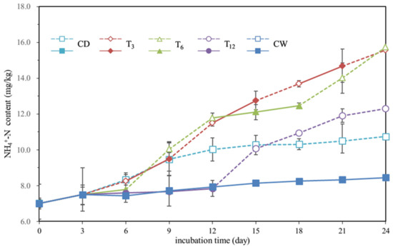 The temporal variations of the soil NH4+-N content under different treatments are shown in Figure 4. Treatments of CW and CD produced the least and second least NH4+-N accumulation, respectively. Treatments subject to drying-rewetting alternation generated more final NH4+-N than continuously dry or wet treatments. There was a pulse of NH4+-N during the drying period in treatment T6 (from 7.6 mg/kg at day 6 to 11.8 mg/kg at day 12). Similarly, the treatment T12 produced stable NH4+-N during the first 12 wet days as in the treatment CW, while a much faster increase of NH4+-N was observed during the following 12 drying days. The final NH4+-N content was twice that of the initial NH4+-N content in the treatment T12. Comparing T3 and T6 with T12, it is seen that more frequent dry-rewetting alternation led to more NH4+-N accumulation. Although treatments of T6 and T12 had similar NO3−-N loss, their NH4+-N accumulations were different and treatment T6 produced more NH4+-N than T12. It seemed that the drying process after wetting period facilitated the production of NH4+-N.