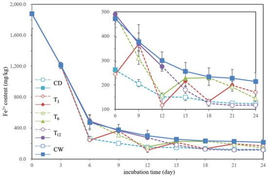 The temporal variations of ferrous iron (Fe2+) under different treatments are presented in Figure 5. In the CD treatment, the Fe2+ content was decreasing due to the oxidation of Fe2+ driven by oxygen. In the CW treatment, although the soils were in anaerobic condition, the Fe2+ content was declining continuously. Stronger oxidation of Fe2+ was observed in the CD than in the CW. The Fe2+ content in the treatment T3 and T6 showed a dropping trend during the drying periods and a rising trend during the rewetting periods. The treatment T12 presented a similar Fe2+ changing trend as in CW during the first 12 wetting days, while a faster decrease of Fe2+ content occurred during the last 12 drying days for T12. The results also demonstrated that dry-rewetting frequency exerted an influence on the final ferrous iron content. Lower dry-rewetting frequency led to less final ferrous iron.