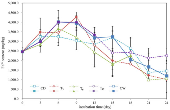 The Fe3+ content increased in the first few days and decreased in the late period for all treatments (Figure 6). In the CW treatment, as well as in the treatment T12, the Fe3+ content reached the peak at t = 6 days and then decreased continuously. In the CD treatment, the Fe3+ content was stable from t = 3 days to t = 15 days and started to drop after t = 15 days. In the treatment T3, the Fe3+ content kept rising in the first 9 days and continuously dropped after that. The Fe3+ accumulation pattern in the treatment T6 was similar to treatments of CW and T12, while there was a rise during t = 15 days and t = 18 days. Unlike the changing pattern of Fe2+, drying-rewetting cycles did not cause the fluctuation of Fe3+ content.