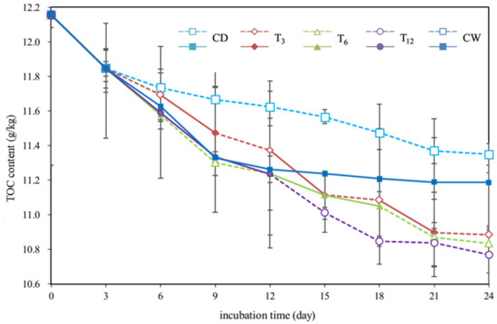 The temporal variations of the total organic carbon (TOC) content under different treatments are shown in Figure 7. It is seen that the overall trend of the TOC contents was decreasing with time for all treatments. In the continuously wet treatment, the TOC content decreased quickly in the early period and declined slowly in the late period. In the continuously dry treatment, the TOC content decreased stably while at a slower rate than other treatments during the whole period. Comparing to CW and CD, the soils subject to drying-rewetting cycles had lower TOC content. However, the final TOC contents of three different drying-rewetting treatments (T3, T6 and T12) were close.