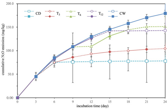 Due to the application of acetylene inhibition in the experiment, nitrous oxide (N2O) was the main gas emission (Figure 8). The accumulative N2O emission is overall consistent with NO3−-N reduction in all treatments. For instance, the nitrate loss was about 104 mg/kg (NO3−-N) in the T3 treatment. At the same time, the cumulative emission of the N2O was about 97 mg/kg (N2O-N) in this treatment. There was 7.9% mismatch in it.