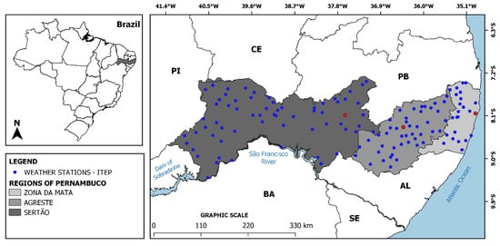 Geographical location of the state of Pernambuco, Brazil, and the spatial distribution of the ITEP weather stations. The three representative stations located in Zona de Mata (lat = −8.05, lon = −34.92, Recife), Agreste (lat = −8.34, lon =−36.43, Belo Jardim), and Sertão (lat = −8.09, lon = −37.65, Custódia) are shown by red circles.