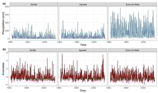 This pattern can also be observed in the rainfall series for three representative stations in Figure 2a. The anomalies series (Figure 2b) show more erratic behavior for Sertão and Agreste, where (especially in Sertão) droughts are more pronounced than in Zona de Mata, where the anomalies series are more uniform throughout the analyzed period.