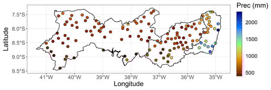 The spatial distribution of the mean annual accumulated rainfall over the state of Pernambuco is shown in Figure 3, where a clear pattern can be observed: the decrease in annual rainfall amounts in the east–west direction, more rainfall in the costal Zona de Mata region, much less rain in the inland semiarid Sertão region, and intermediate rainfall amounts in the transition Agreste region.