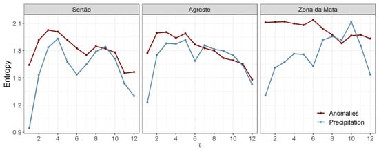 For all regions, lower entropy values were found for τ = 1 and τ = 12, reflecting intra-annual rainfall variability (well-defined dry and wet seasons) and interannual seasonality, respectively. This effect was less pronounced for rainfall anomalies where seasonality is removed. For intra-annual temporal scales for Sertão, the entropy values of the anomaly series were lower for τ = 3 and τ = 9, which can be attributed to the duration of the wet (3 months) and dry (9 months) seasons.
