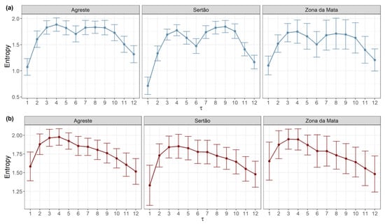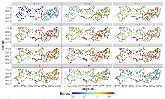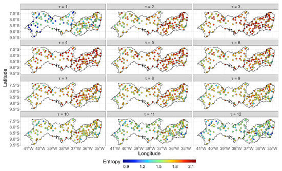 For the original series (Figure 5), for = 1 the entropy increases in the west–east direction, indicating the highest regularity and predictability of rainfall dynamics in the deep inland Sertão region, and the lowest regularity and predictability in the coastal region. For higher temporal scales ( = 2, …, 12), the entropy values increase from Sertão towards Agreste, and then decrease towards the coast, indicating that the rainfall regime is the most irregular and the least predictable in the Agreste region, which is a climate transition zone.