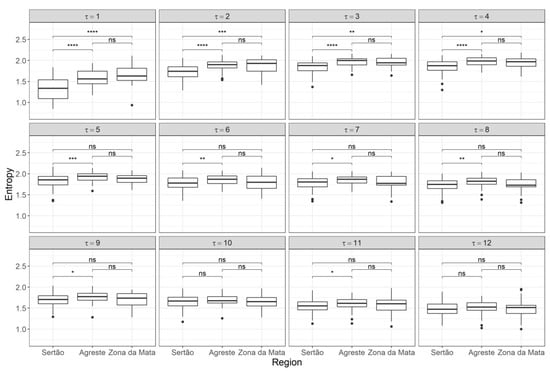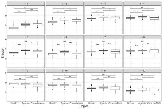 Boxplots for MMSE values (anomalies series) for the regions of Zona de Mata, Agreste, and Sertão for τ = 1, 2, …, 12. “*”, “**”, “***”, “****” indicate that there is a significant difference between the regions at the 5%, 1%, 0.1%, 0.01% significance level, respectively; “ns” means not significant.