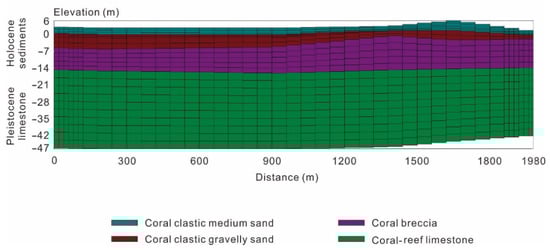 A two-dimensional numerical density-dependent groundwater flow and solute transport model is developed to represent the profile of a coral island using SEAWAT [], which can effectively reduce the computational workload and improve the efficiency of calculation. The source code for SEAWAT was developed by combining MODFLOW and MT3DMS into a single program that solves the coupled flow and solute-transport equations. MODFLOW was modified to solve the variable-density flow equation by reformulating the matrix equations in terms of fluid mass rather than fluid volume, and by including the appropriate density terms. This interpretative model is used to simulate the dynamics of freshwater lenses of coral islands with similar hydrogeological conditions. The model is run for 100 years, during which time the freshwater lens develops; the model reaches a steady state (i.e., the morphology of lens stays relatively stable) within 50 years. The model includes 22 layers with a depth of 50 m to improve on the vertical resolution in the model simulation and is discretized into 41 columns in the horizontal direction with refinement at the boundaries. Constant head boundaries are defined along both sides of the domain to simulate the sea level, with density specified at 1025 kg/m3, representative of typical seawater composition. Constant concentration boundaries are assigned to the same grid cells as the constant head boundaries with chloride concentrations of 19000 mg/L. Assuming that the loose sediments of the coral island are initially saturated by seawater, the initial chloride concentration of the entire model domain is specified at 19,000 mg/L. The ground surface is provided by the topographic map, and the lithology is based on boreholes. The model grid is shown in Figure 2.