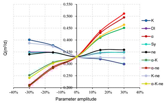Due to the uncertainty of hydrogeological parameters, QT in the above-mentioned pumping wells layout scheme is also uncertain. Hydraulic conductivity (K), vertical dispersion coefficient (DI), precipitation infiltration coefficient (α), effective porosity (ne), and specific yield (Sy) are the influencing factors: